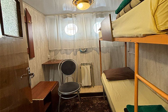 К категории Эконом+ 1+1 (нижняя палуба) относятся каюты: 121-123, 125, 132-135, 142. Двухместная двухъярусная каюта с частичными удобствами, расположенная на нижней палубе. Возможно размещение второго человека на дополнительном месте верхнего расположения. В каюте: двухъярусная кровать, столик, зеркало, раковина, вешалка для верхней одежды, иллюминатор.