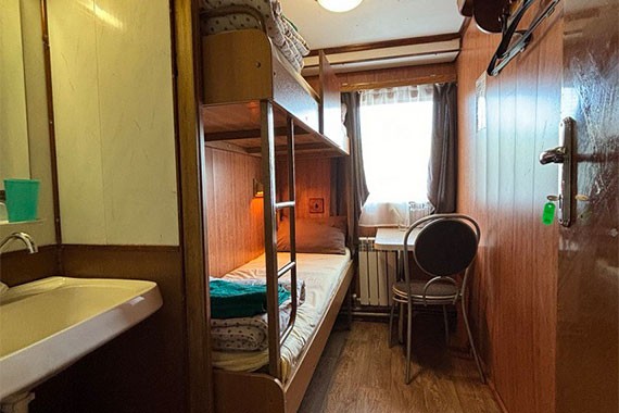 К категории Эконом+ 2+1 (нижняя палуба) относятся каюты: 124, 126-131, 136-141, 143. Двухместная двухъярусная каюта с частичными удобствами, расположенная на нижней палубе. Возможно размещение третьего человека на дополнительном месте верхнего расположения. В каюте: две односпальные кровати и одно спальное место верхнего расположения, раковина, столик, зеркало, вешалка для верхней одежды, иллюминатор.