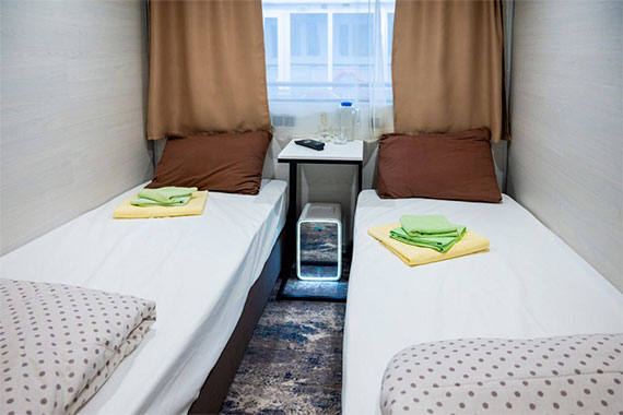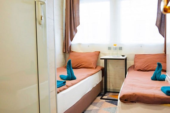 К категории Эконом+ 1+1 (главная палуба) относятся каюты: 88-103. Двухместная двухъярусная каюта с частичными удобствами, расположенная на главной палубе. Возможно размещение второго человека на дополнительном месте верхнего расположения. В каюте: двухъярусная кровать, раковина, столик, зеркало, вешалка для верхней одежды, обзорное окно.